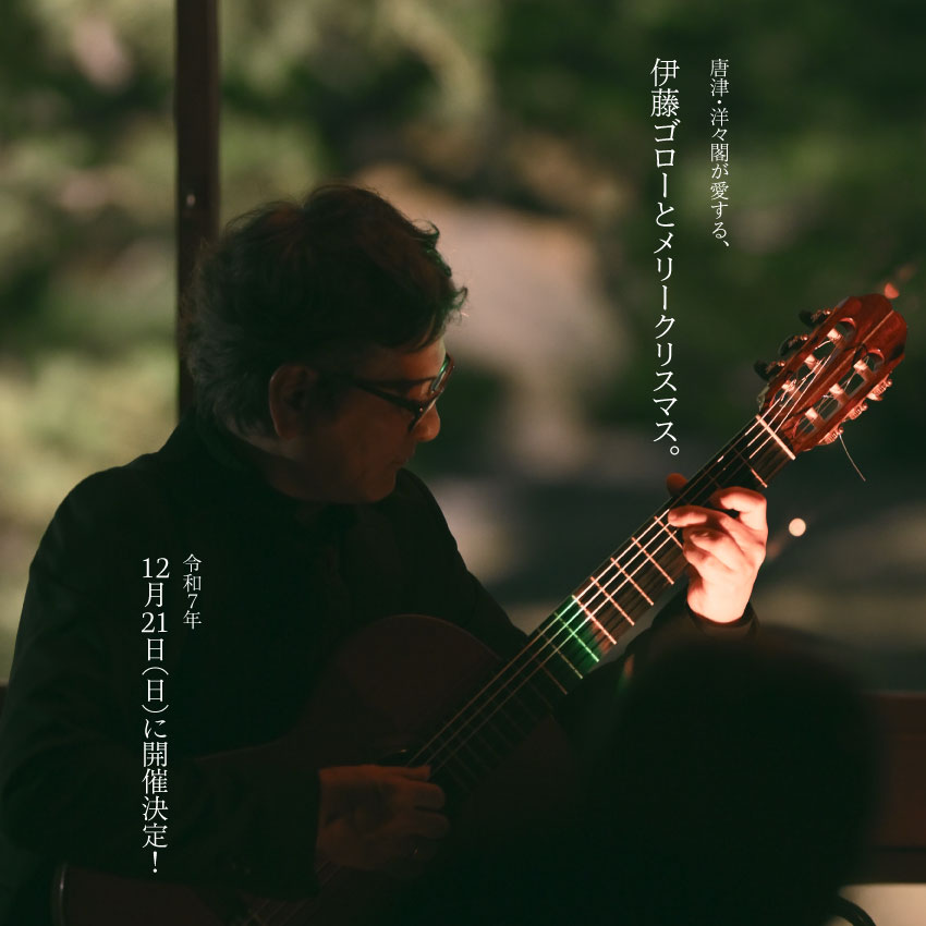 ひとたびその音が鼓膜を震わせると、心の奥まで響く。あの美しく繊細なギターが今年も聖なる夜に帰ってきます。ゲストは5度目となるチェロの名手・ロビン=デュプイ。ギターとチェロの重ね奏でる音色に触れる艶やかで聖なる一夜、唐津が誇る老舗旅館・洋々閣が愛する、伊藤ゴローとメリークリスマスに乞うご期待ください。