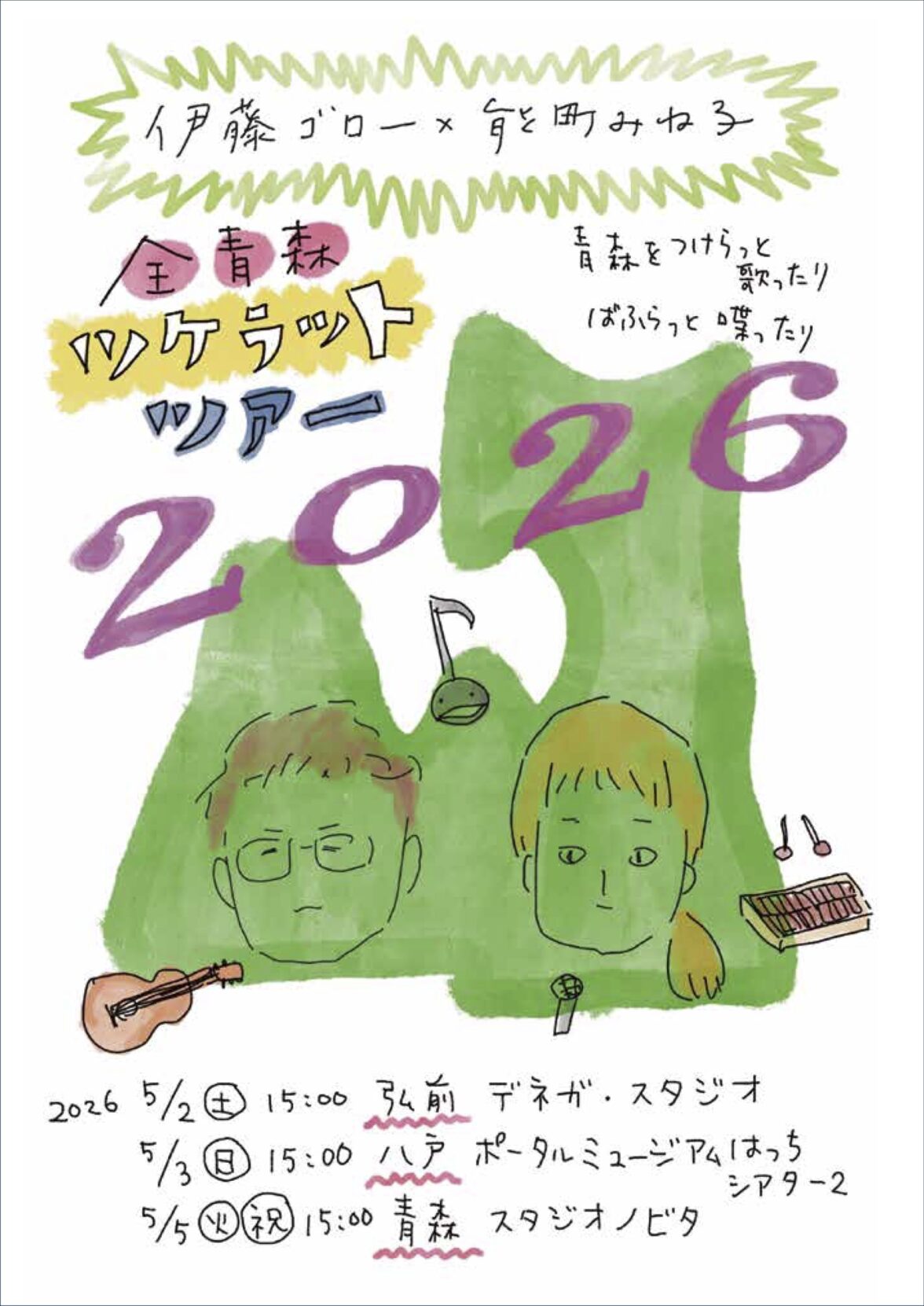 青森市出身の伊藤ゴローと、青森好きの能町みね子が、青森について歌ったり語ったりする、青森でしかやらないライブ。